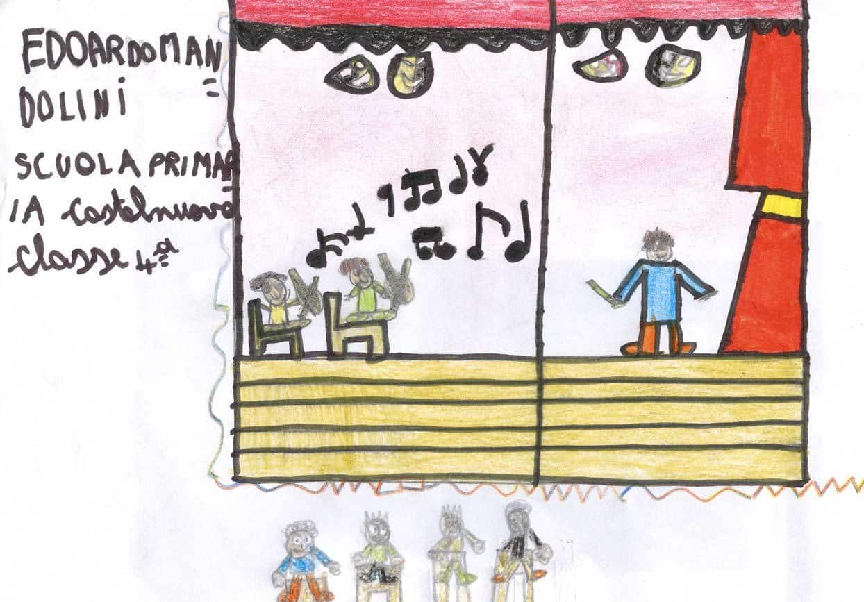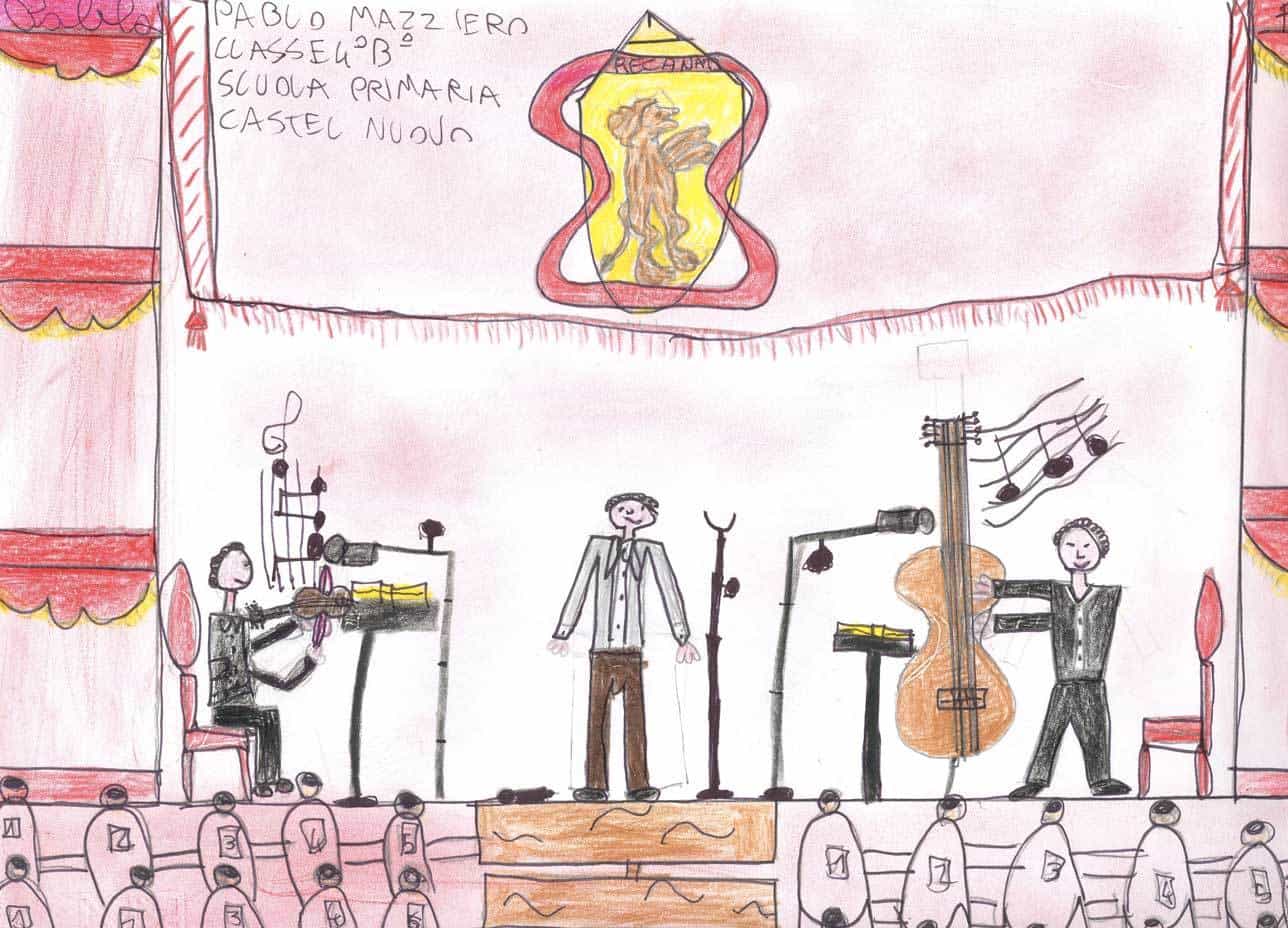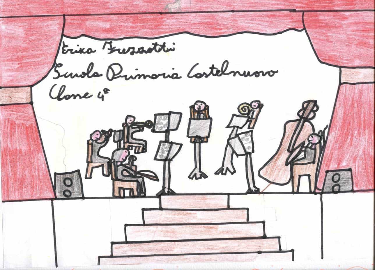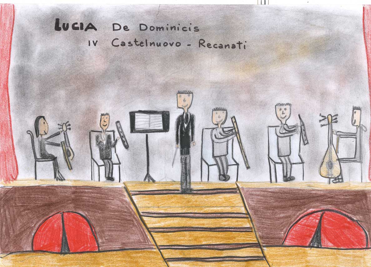 In occasione dell’appuntamento di O come Orchestra, a cura di Form – Fondazione Orchestra Regionale delle Marche, molti bambini delle scuole elementari hanno assistito, al Teatro Persiani di Recanati il 27 novembre e al Teatro Concordia di San Benedetto del Tronto il 12 dicembre, a una lezione concerto intitolata Archi, fiati (legni, ottoni), dove son le percussioni? durante la quale la filarmonica regionale delle Marche, guidata da Fabio Tiberi, ha eseguito musiche di Rossini, Mozart, Bizet, Strauss e Gershwin mettendo in luce le specificità tecniche e timbriche di ciascuno strumento che compone l’orchestra. Impressionati da questa esperienza, i bambini hanno realizzato dei disegni che riportiamo qui.