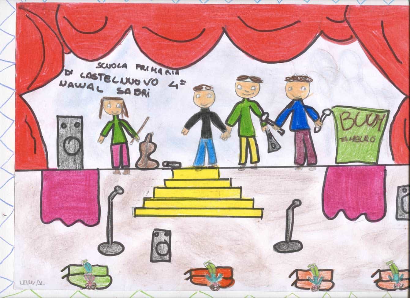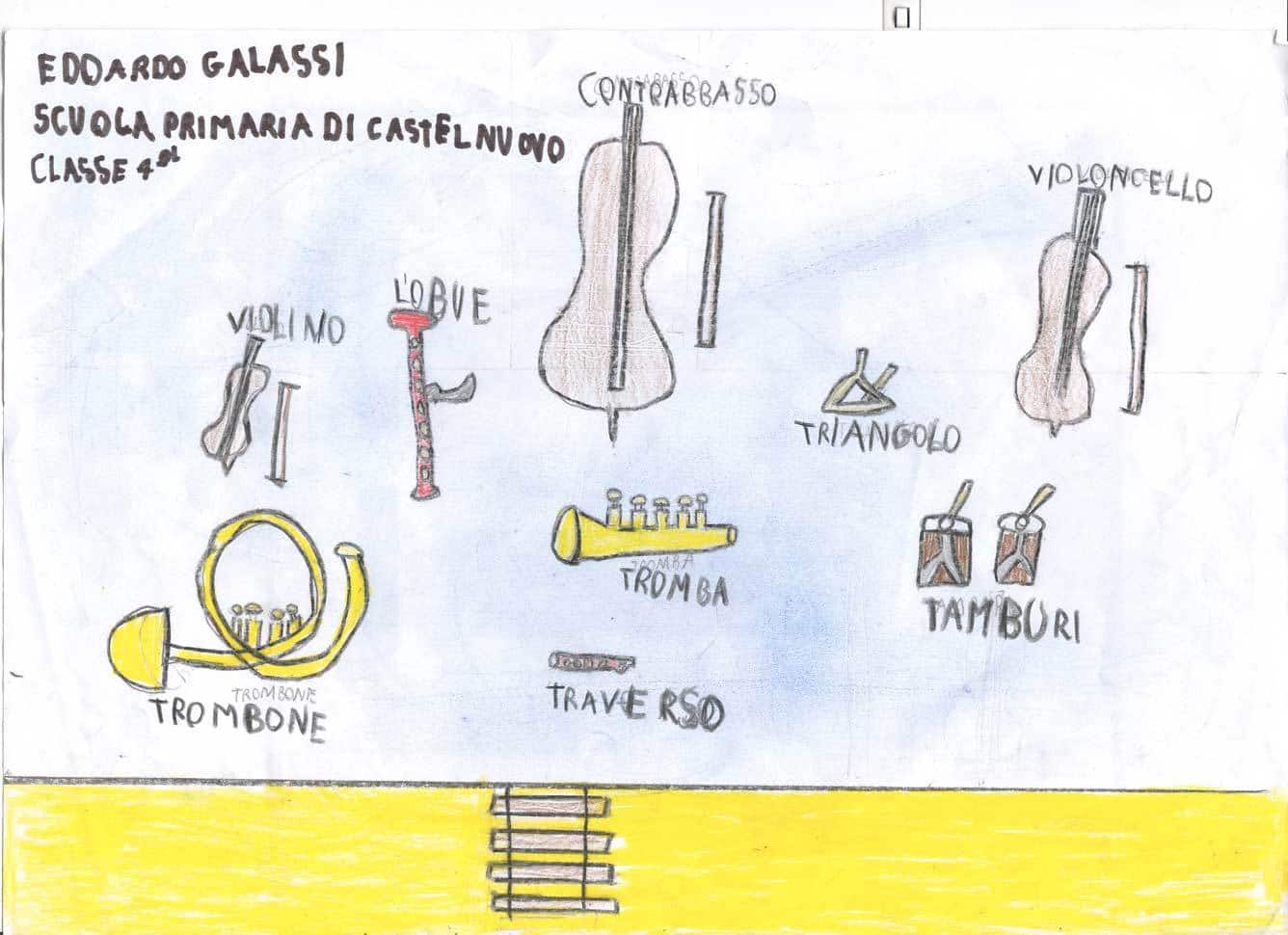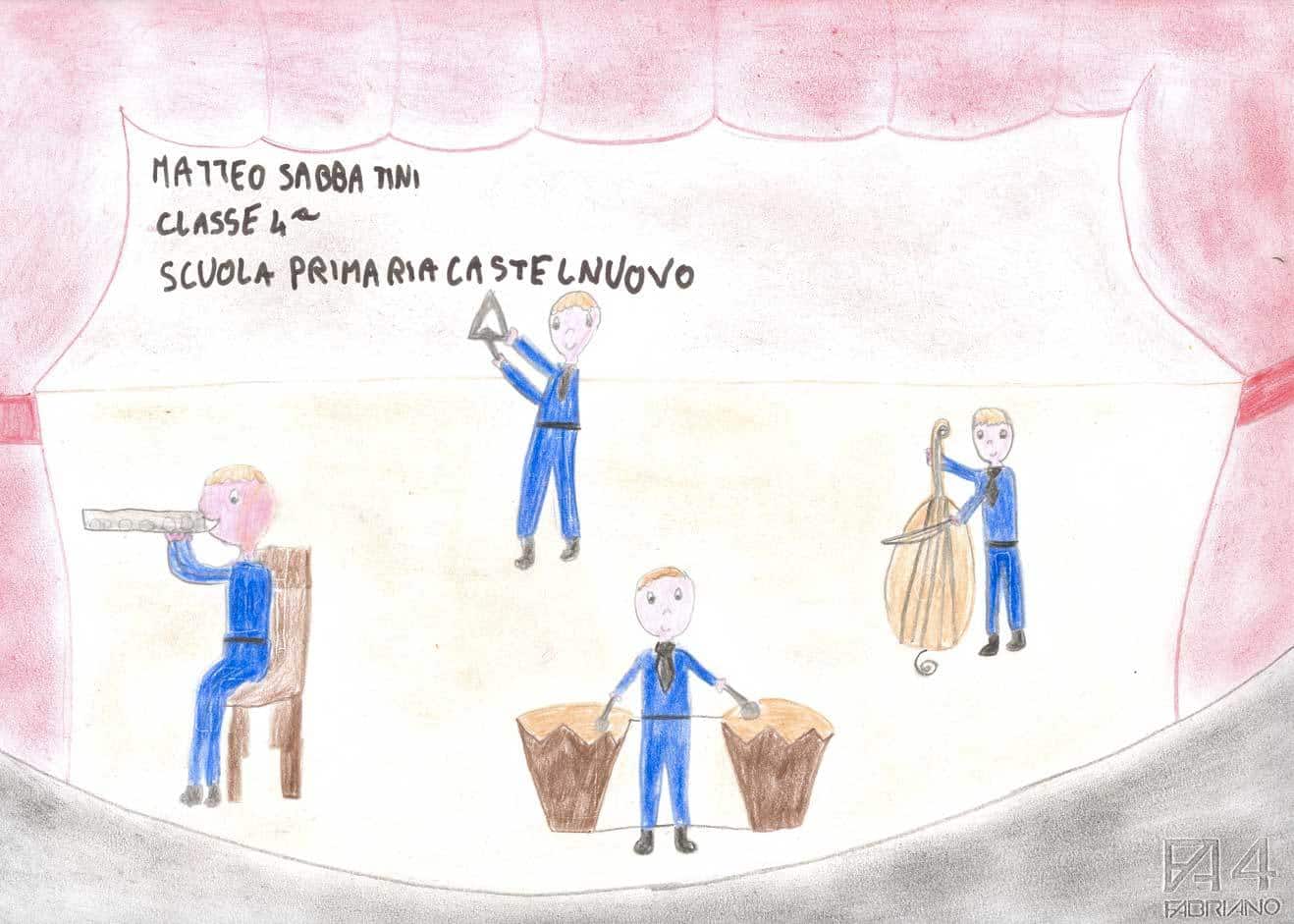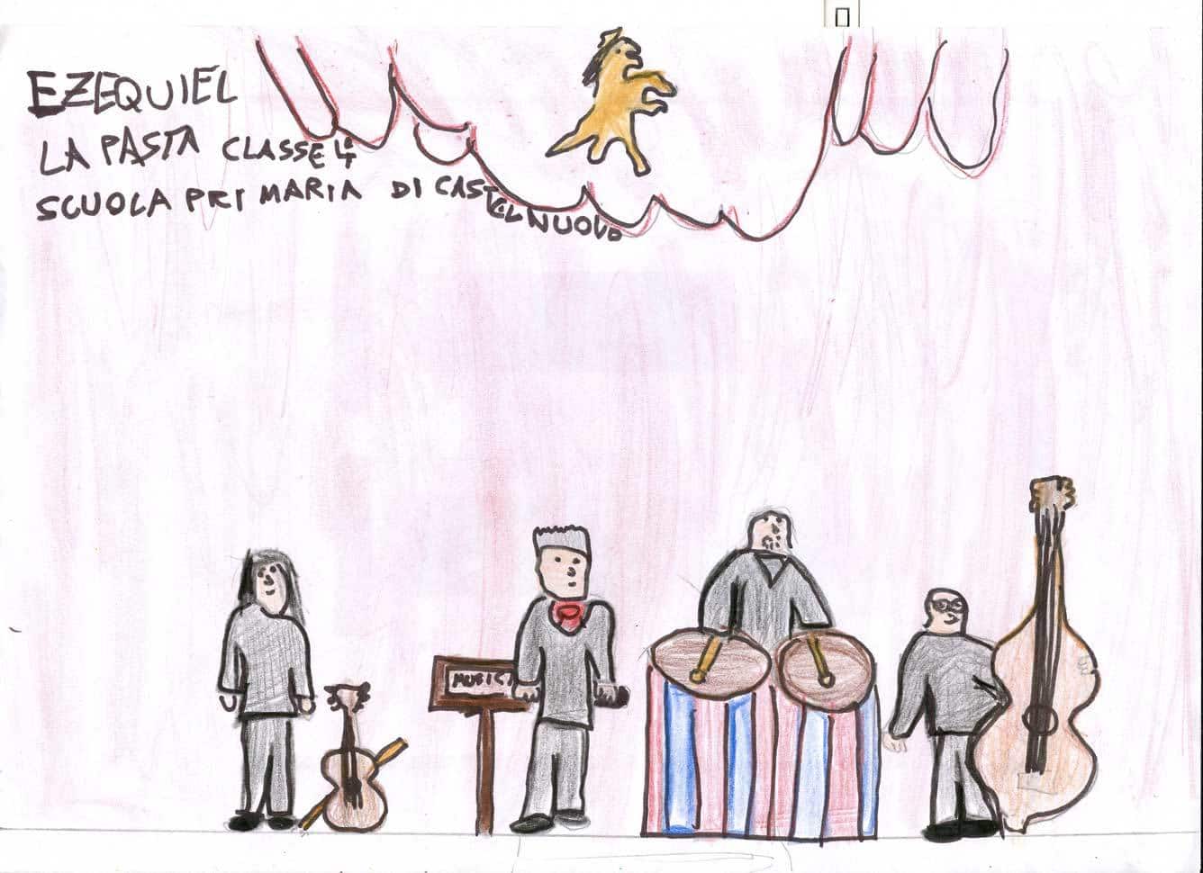 In occasione dell’appuntamento di O come Orchestra, a cura di Form – Fondazione Orchestra Regionale delle Marche, molti bambini delle scuole elementari hanno assistito, al Teatro Persiani di Recanati il 27 novembre e al Teatro Concordia di San Benedetto del Tronto il 12 dicembre, a una lezione concerto intitolata Archi, fiati (legni, ottoni), dove son le percussioni? durante la quale la filarmonica regionale delle Marche, guidata da Fabio Tiberi, ha eseguito musiche di Rossini, Mozart, Bizet, Strauss e Gershwin mettendo in luce le specificità tecniche e timbriche di ciascuno strumento che compone l’orchestra. Impressionati da questa esperienza, i bambini hanno realizzato dei disegni che riportiamo qui.
