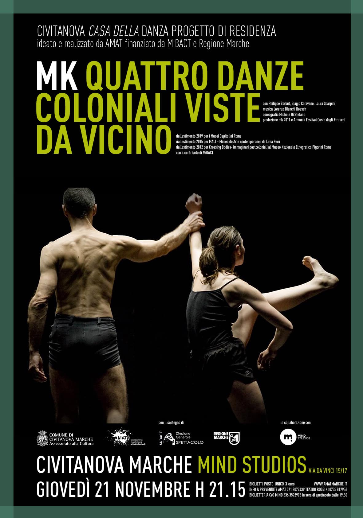 A novembre quindi la compagnia mk guidata da Michele Di Stefano, ha portato in scena lo spettacolo Quattro danze coloniali viste da vicino in un luogo altro, diverso dal teatro. Per la prima volta infatti i corpi danzanti di Philippe Barbut, Biagio Caravano e Laura Scarpini hanno portato il pubblico a guardare con occhi diversi il Mind Studios, un locale ricavato da una ex officina del porto civitanovese dove solitamente si ascoltano concerti. Grazie alla danza un ambiente dedito a tutt’altra attività ha ospitato lo spettatore trasportandolo verso mondi altri, portandolo in territori inesplorati, proprio come la nostra cara Alaska.