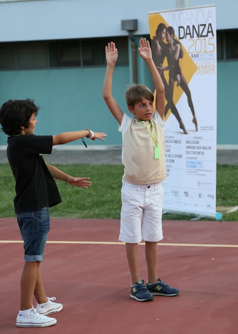 La prima giornata di Civitanova Danza 2015, domenica 12 luglio, ha ospitato una festa pensata per tutta la famiglia. Presso la Biblioteca Zavatti e i suoi giardini, dalle ore 19, i bambini hanno preso parte a un microlaboratorio di danza condotto da Mara Cassiani, in cui si sono divertiti a realizzare forme geometriche, animali o oggetti astratti. Al termine del laboratorio abbiamo chiesto loro quale momento avessero preferito e le risposte sono state molto soggettive: chi ha amato riprodurre la pioggia, chi il serpente, la piantina, l’alberello, i puntini, e chi l’otto; anche i genitori hanno espresso la loro opinione, dicendo che è stato divertente ma anche “piacevolmente alternativo” sia per l’utilizzo della musica sia per i movimenti ricercati.